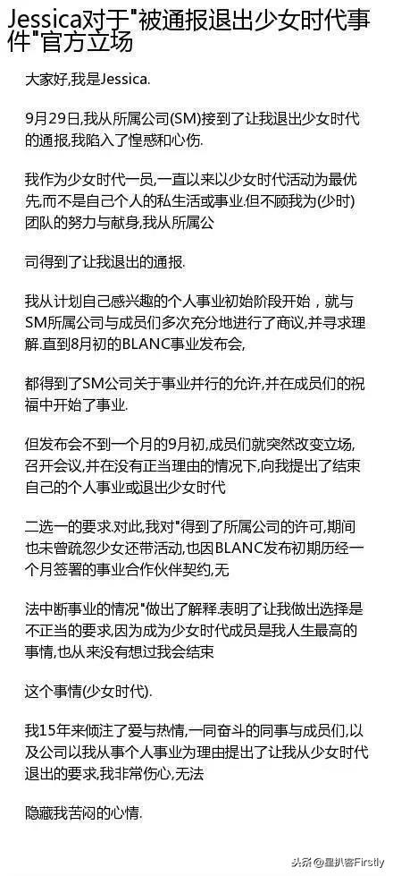 在此之后,Jessica发表长文来回溯整件事时提到自己被告知的退团原因是公司要求自己在个人事业和团体之间二选一。