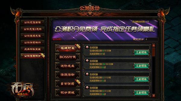 除了精彩的击杀BOSS和活跃度任务外,公测版本还带来了四大福利活动,助力玩家加速成长。累计签到,送稀有远古武器和至尊华丽套装;累计充值满足额度,即获百万金币、强力成长道具、进阶礼盒等超值豪礼;新服火速冲冲冲,经验药水成助攻,让你狂飙300级不再是梦;微端在线30、60、180分钟,海量金币、经验药水、回城卷、装备鉴定卷轴、飞鞋等超实用作战物资将成为你的囊中之物!