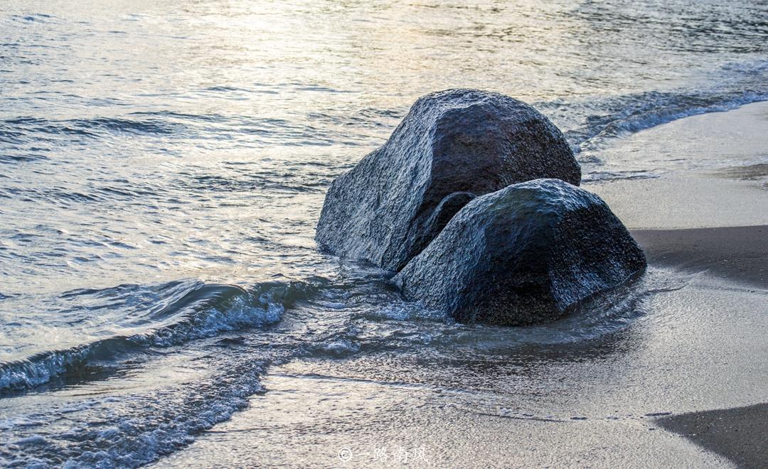 沙滩上点缀着形状、大小不一的礁石,阵阵海浪从远至近袭来,激起层层浪花,好像在奏响激昂的交响乐。
